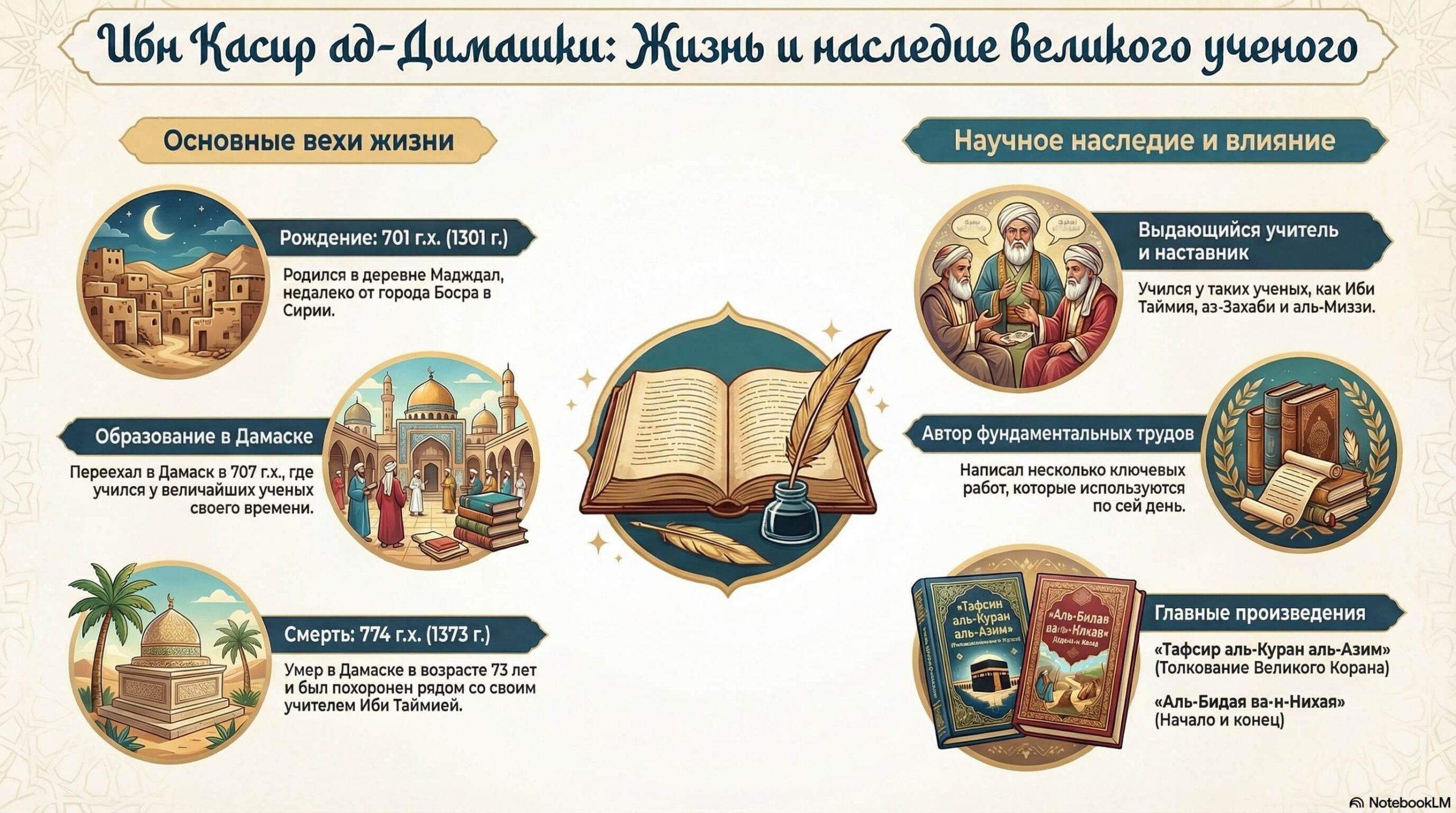 Ибн Касир ад-Димашки, чье полное имя Имадуддин Абу аль-Фида Исмаил ибн Умар ибн Касир аль-Кураши ад-Димашки, был выдающимся имамом, хафизом, факихом, муфассиром и историком эпохи Мамлюкского султаната (701–774 г.х. / 1301–1373 н.э.).